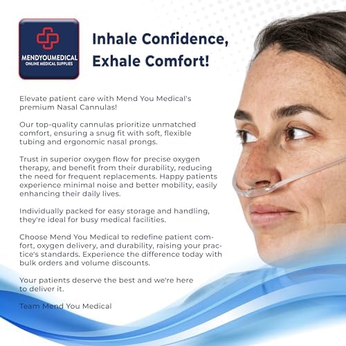 Introducing the Mend You Medical 7-FOOT CURVED TIP NASAL CANNULA – Your Ultimate Soft Nasal Cannula for your Oxygen Therapy! Supreme Comfort: Our mission is your comfort, and our 7-FOOT CURVED TIP NASAL CANNULA embodies that commitment. Crafted with a soft, latex-free one-piece split nasal design, it’s all about providing you with the utmost comfort during your oxygen therapy. Say goodbye to discomfort and hello to hassle-free, hi-flow oxygen breathing. Discover the Perfect Fit: Your nose deserves nothing less than perfection. Our soft, anatomically curved cannula nasal tubing for oxygen prongs are expertly designed to seamlessly adapt to your nose’s contours. The innovative curved tip cannula masterfully guides airflow, ensuring minimal irritation during extended therapy sessions. Experience reduced pressure on your face and ears, elevating your overall comfort when using Mend You Medical’s Curved Nasal Cannula- 7 Foot Cannula Hospital Grade Oxygen Delivery: Your peace of mind is paramount to us. That’s why our curved tip cannula nasal tubing delivers consistent and dependable oxygen delivery, ideal for patients with critical needs. Manage respiratory conditions like asthma, bronchitis, and respiratory therapy with confidence in our hospital-grade oxygen delivery. Seamless Oxygen Flow: Uninterrupted oxygen therapy is a necessity, and our secure connection to your oxygen source ensures just that. Place your trust in the Mend You Medical curved tip cannula nasal tubing for a consistently smooth oxygen flow. Make it an integral part of your oxygen therapy regimen and experience the difference for yourself. Elevate your oxygen therapy experience to a whole new level of comfort and reliability with the Mend You Medical 7-FOOT CURVED TIP NASAL CANNULA. Your comfort is our priority, so make it your choice today and say hello to a more comfortable and effective oxygen therapy journey!