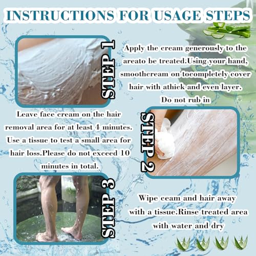 🎯【Easy to Use】Apply a small amount of depilatory cream to the area to be epilated, leave it on for at least 4 minutes, wipe it off with a soft cloth or paper towel, and then rinse the epilated area with water.