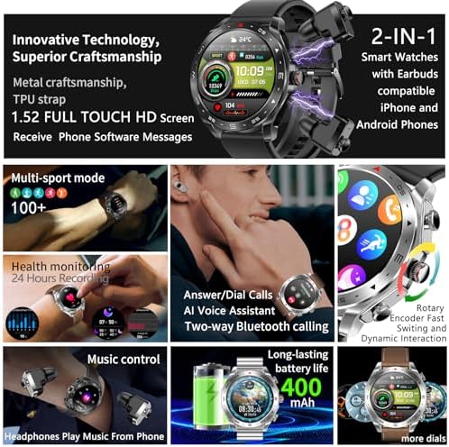 Military Smart Watch with Earbuds,Round 1.52” HD Big Screen (Make/Answer Calls),Fitness Tracker with Sleep Monitor, 100+ Sports Modes,for iPhone & Android Phones Men and Women