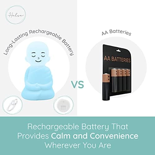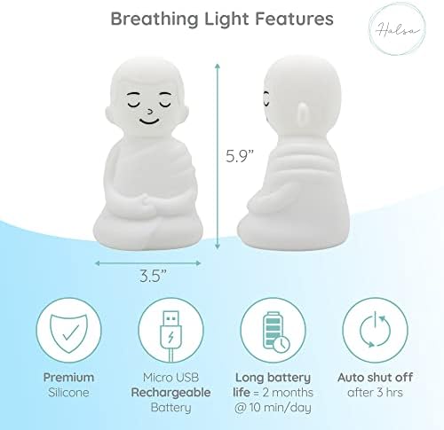🔋 TECHNICAL SPECS: The breathing buddy is made of premium, high grade, soft silicone and features a built in, timed breathing cycle guided by changing light colors. The mindfulness light stands about 6 inches tall and features a rechargeable battery so you can take it with you on the go! The battery should last about 2 months if used for 10 minutes daily. There is an auto shut off feature after 3 hours to preserve battery life, and the colors illuminated are calming and relaxing by design.