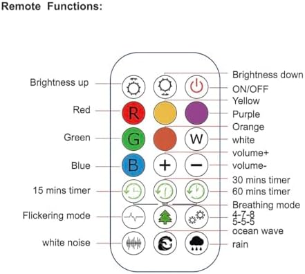 WITH IT’S VERSATILE FUNCTIONALITY – this device can be controlled in three convenient ways: tap, switch , or remote control. It’s easy to customize your experience and find the perfect settings to suit your needs. Three Timers: push button on remote 15 min, 30 min, or 60 min. The sounds: White noise, ocean & rain, along with the colors: warm white, red, yellow, blue, purple, orange & green, create a soothing atmosphere for improved relaxation. You can adjust the brightness and volume to create your custom environment for the ultimate sense of peace. *If Using Remote- Turn Power Button On at Bottom of Base First- Then Turn Power on Remote* * Can be used without remote*
