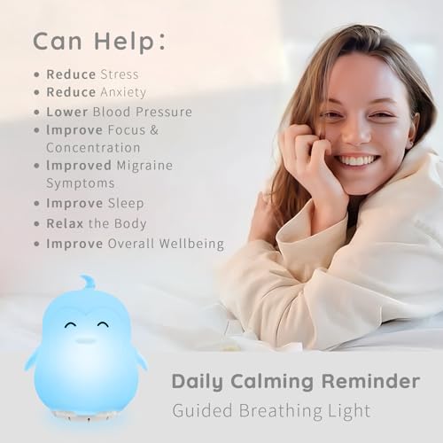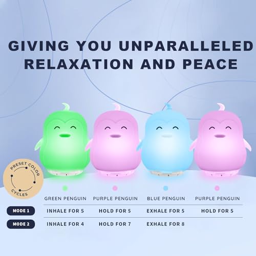 Mindfulness Breathing Penguin 4/7/8 & 5/5/5/5 Guided Visual Meditation Breathing Light & Sound 3 in 1 Device with Night Light & Sound Machine for Anxiety Stress Sleep ADHD Gift Women Men Kids