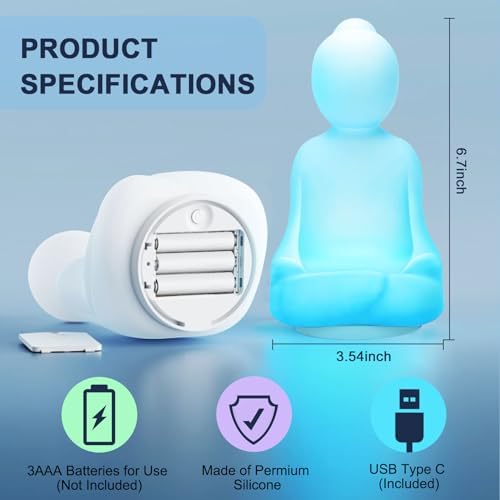 👍Features-Premium Quality Silicone. SIZE: 3.5×6.7 inches. The meditation breath light has two power supply modes, one is 3*AAA batteries(Not included), and the other is powered by USB-C cable (included). Preset calming color cycles & auto shut off after 2 hrs
