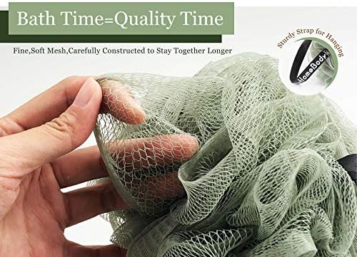 myHomeBody Large 70g Loofah Sponge, Bath Body Scrubber for Women, Men | Exfoliating Shower Pouf with Activated Charcoal – 2 Graphite Gray + 1 Sage Green, 3 Pack