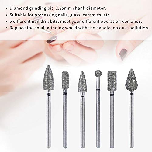 Made of high quality material, and stable to use.Diamond grinding bit, 2.35mm shank diameter.Suitable for processing nails, glass, ceramics, etc.6 different nail drill bits, meet your different operation demands.Excellent durability and cutting performance.Replace the small grinding wheel with the handle. According to different grinding requirements to choose different types of installation and use.