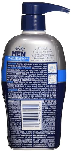 Nair for Men Hair Remover Body Cream 13 Ounce (Pack of 2). Then Nair for Men Body Cream is perfect for you, with a thick formula and improved fragrance for optimal performance. Use it both on large and small areas without hesitation it is easy on skin when used as directed and hair grows back soft and not stubbly.