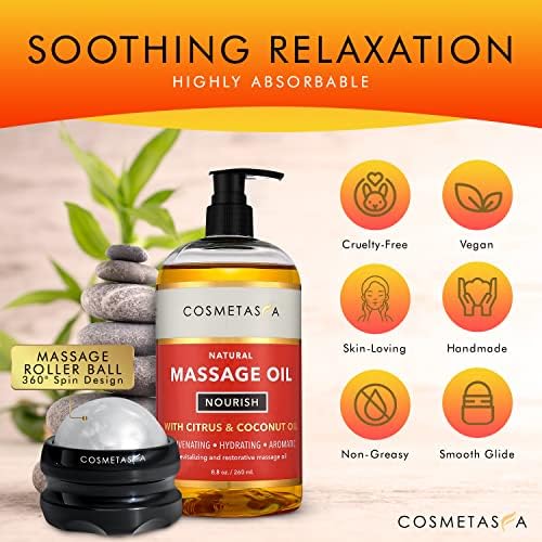 Natural Nourishing Massage Oil with Massage Roller Ball – Therapeutic Citrus & Coconut Massage Oils with Rejuvenating, Hydrating & Aromatic Essential Oils for Dry Skin, Soothes Muscle & Joints 8.8 oz