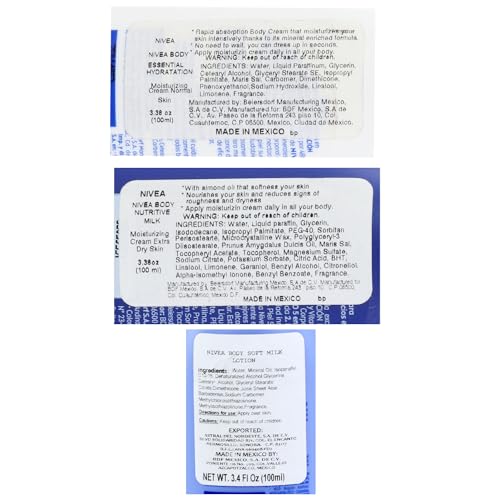 Experience the deep hydration of all of these Nivea lotions in a convenient 3.4 oz size! This bundle includes 3 different Nivea Milk lotions including: Nivea Soft Milk Piel Seca, Nivea Milk Nutritiva Piel Xtra Sec, and Nivea Body Milk Normal.