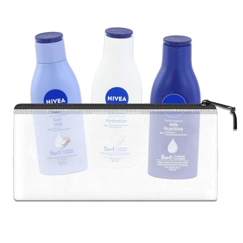 Nivea Lotion Bulk Travel Set – Nivea Milk Lotion Bulk Bundle with 3 Different Nivea Travel Size 3.4 oz Bottles Plus Travel Bag | Nivea Lotion Travel Size Bulk. Experience the deep hydration of all of these Nivea lotions in a convenient 3.4 oz size! This bundle includes 3 different Nivea Milk lotions including: Nivea Soft Milk Piel Seca, Nivea Milk Nutritiva Piel Xtra Sec, and Nivea Body Milk Normal. These rich formulas instantly give you glowing and hydrated skin the first time you use it! In addition, these Nivea lotions will keep your skin protected from the sun and keep your skin young! The Nivea lotions get to work quickly, leaving your skin feeling smooth, hydrated, and protected for up to 24 hours! This TSA-friendly travel size set of Nivea lotion bulk also comes with a bonus travel bag for convenient carrying!