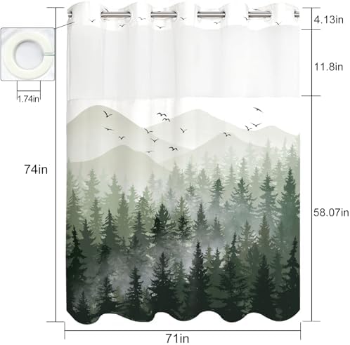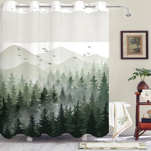 No Hook Shower Curtain with Snap in Liner Sage Green Misty Forest Hookless Shower Curtains for Bathroom Foggy Nature Pine Tree Mountain Woodland Waterproof Fabric Bath Curtain Decor 71×74In