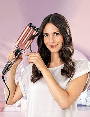 【WORKS ON ALL HAIR TYPES】Whether you have short or long locks; thick or thin, this three-barrel curling iron works like a charm. The heated ceramic produces negatively charged ions that create soft, shiny waves without any frizz. And unlike single barrel styling irons that take ages to curl hair, this 3 barrel curling iron does it in a matter of minutes.