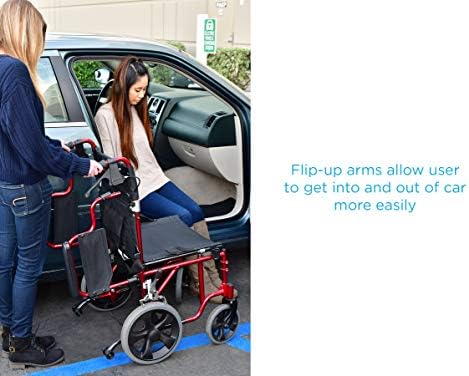 NOVA Lightweight Transport Chair with Locking Hand Brakes, 12″ Rear Wheels, Removable & Flip Up Arms for Easy Transfer, Anti-Tippers Included, Color Red