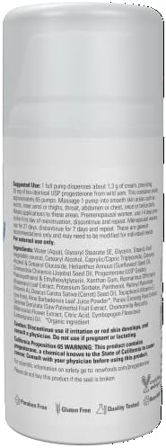 1 full pump dispenses about 1.3 g of cream, providing 20 mg of USP progesterone. This container yields approximately 65 pumps. Massage 1 pump into smooth skin areas such as wrists, inner arms or thighs, throat, abdomen or chest, once or twice daily. Rotate applications to these areas. Premenopausal women, use 14 days prior to the first day of menstruation, discontinue and repeat. Menopausal women, use for 21 days, discontinue for 7 days and repeat. These are general recommendations only and may need to be modified for individual needs. NOW® Solutions products are not tested on animals.
