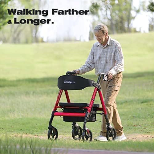 OasisSpace Heavy Duty Rollator Walker – Bariatric Rollator Walker with Large Seat for Seniors Support Up 450 lbs (Red)
