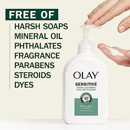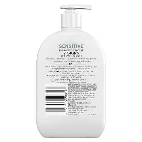 GENTLE Cleanser: The OLAY Sensitive Facial Cleanser with Oat Extract delivers a gentle clean, and hydrates to soothe seven signs of sensitive skin: dryness, flakiness, itchiness, weak skin barrier, irritation, and tightness