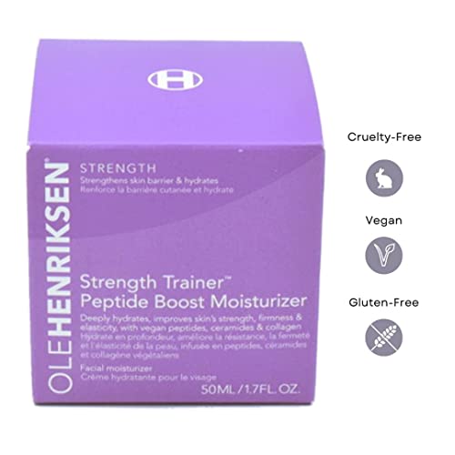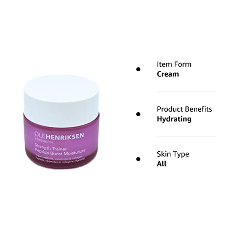 OLEHENRIKSENStrength Trainer Peptide Boost MoisturizerSize: 1.7 oz/ 50 mLA daily moisturizer packed with peptides, collagen, and hyaluronic acid that’s clinically tested to instantly double hydration, boost elasticity, and improve the look of fine lines and wrinkles, while also reinforcing your moisture barrier.Key Ingredients:- Eight Amino Acids: Hydrate, supporting skin elasticity.- Eight Peptides: Condition and support strong skin.- Three Ceramides: Bind moisture, fortifying skin’s moisture barrier.How to Use:- Apply evenly to face and neck AM and PM.- Use with Banana Bright Eye Crème to reduce the look of dark circles.- Use with Banana Bright Vitamin C Serum to get brighter, bouncier skin.Precautions:For external use only. Use as directed.
