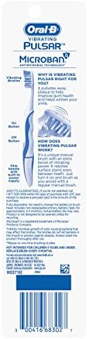 The Oral-B Pulsar Microban toothbrush has battery powered Vibrating bristles to help breakup plaque between teeth. This toothbrush removes 90% of plaque in hard to reach places. These bristles are protected from bacteria*. Oral-B is #1 Used by Dentists Worldwide. *Inhibits microbial growth of odor-causing bacteria that may affect the bristles. The bristles do not kill bacteria in the mouth or protect against disease. Always clean the product thoroughly after use.