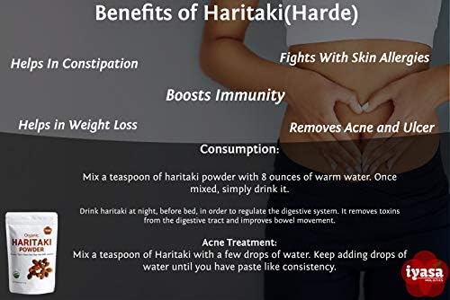 🍀 USDA Organic, Non-GMO: Iyasa Organic Haritaki Fruit Powder is sourced from NOP(USDA) certified farms of India and packaged in FDA registered facility. It is Non-GMO, vegetarian, vegan; gluten, Soy, Wheat and Corn free.