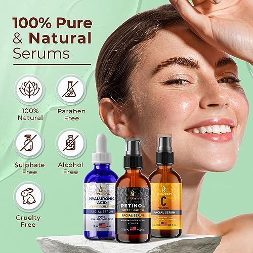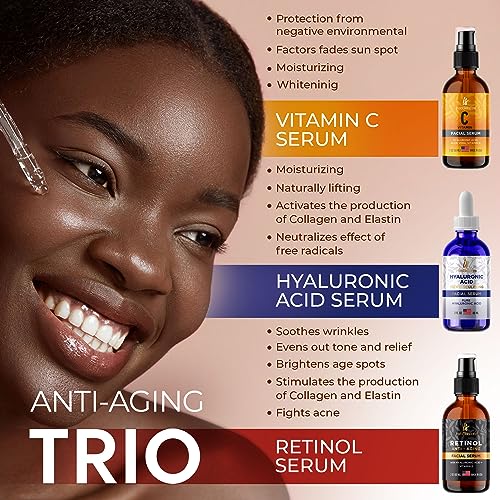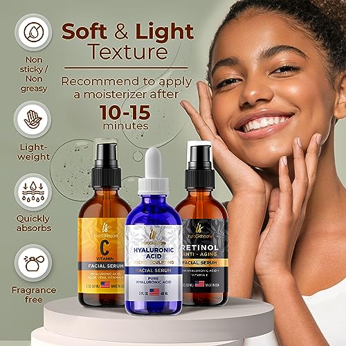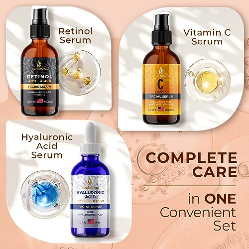 Pack of 3 Vitamin C & Hyaluronic Acid & Retinol Serums Natural Skin Care Facial Treatment Neck & Chest Anti-Aging Serum Fights Pigmentation Fine Lines and Wrinkles