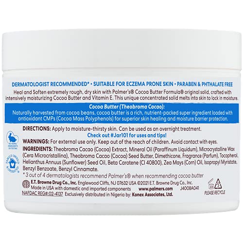When it comes to dry skin solutions, cocoa butter is the answer. This multipurpose moisturizer does it all. When you’re deciding between a lotion, cream, ointment, or balm to find the best solution for dry skin, cocoa butter harnesses its natural power to heal, protect, soothe, and soften rough, dry skin. Cocoa butter can easily absorb and provide deep and long-lasting moisture, and forms a barrier between your skin and the elements to seal in all-day moisture, keeping your skin hydrated no matter what it’s like outside. Palmer’s Cocoa Butter Formula Original Solid Lotion is crafted with intensively moisturizing Cocoa Butter and Vitamin E. If you’re looking for a lotion for dry skin, look no further than this unique multi-use concentrated solid balm. This versatile body balm has over 101 uses, and can also be used as a daily lip balm, makeup remover, primer for lipstick or eyeshadow, foot mask, hand mask, shaving cream, face moisturizer, in-shower moisturizer, hair conditioner, and more! Proudly made in U.S.A., Palmer’s has been a trusted brand for over 180 years, providing high-quality natural products that are passed down from generation to generation.