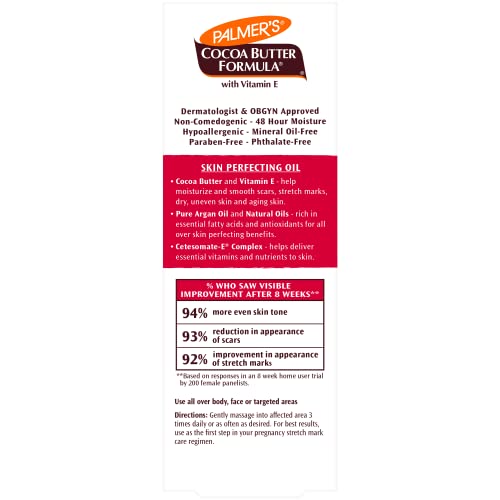 You’ve heard of using creams and lotions to help your skin stay hydrated or heal dry, damaged skin, but have you considered moisturizing body oils? Some of the best body oils for glowing skin have naturally-derived ingredients, including cocoa butter, coconut oil and argan oil. The Palmer’s Skin Therapy Oil collection harnesses all of the cocoa butter benefits and blends it with other skin-loving ingredients to hydrate and pamper your skin. Cocoa butter is a natural emollient that works well for moisturizing skin and aiding with scar lightening, while Vitamin E is rich in antioxidants and helps to heal damaged skin. When blended together they help to minimize scars and keep skin hydrated and healthy-looking. Not only is Skin Therapy Oil one of the best oils for dry skin on the body, it also helps improve the appearance of imperfections. A staple in many women’s skin care routines, this advanced multi-purpose dry oil is rich in essential fatty acids, vitamins and antioxidants to perfect skin all-over-the body by improving the appearance of stretch marks, scars and dry, damaged or uneven skin. Try the Palmer’s Skin Therapy Body Oil in the original or rosehip fragrance for hydrated, glowing and perfected skin.