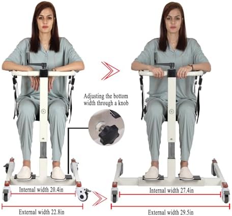 PATIENT LIFT WHEELCHAIR FOR HOME: Our patient lift for home patient transfer chair has a bottom width of 22.8 to 29.5 inches and a height adjustment range of 33.5 to 45 in, suitable for people with a body width of less than 18 inches. This adaptability ensures a perfect fit in various environments, effortlessly integrating into bedrooms, living rooms, or bathrooms.