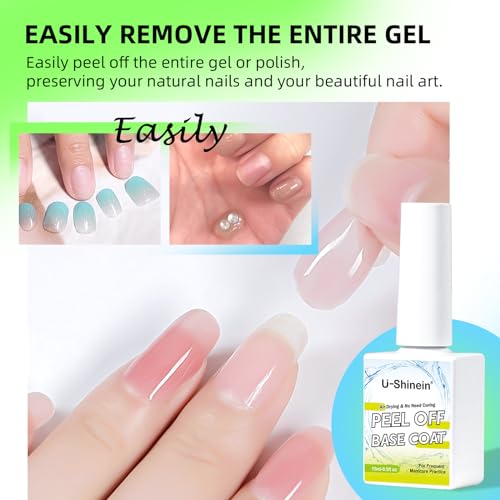 EASY APPLICATION: Applying our Peel-off Base Gel is a breeze. After preparing and buffing your nails, simply apply a layer of the base coat and let it air-dry. Then, proceed with your desired nail art, curing each layer as needed. When it’s time to remove, use tweezers to gently lift a corner of the polish and peel it off slowly. For easier removal, soak your nails in warm water before peeling.