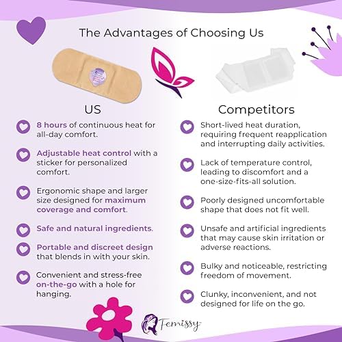 ♕ 𝗦𝗜𝗭𝗘 𝗗𝗢𝗘𝗦 𝗠𝗔𝗧𝗧𝗘𝗥! Big patches, big relief. With our above-average menstrual cramp heating pad size, you’ll get more coverage, delivering longer-lasting heat, for all-day comfort, so you can dance, run and laugh without a care in the world. Plus, our unique medical pressure sensitive adhesive makes removal a breeze, so you can say goodbye to the discomfort of taking off traditional stick on heating pads for cramps. Made with you in mind, because you deserve it!