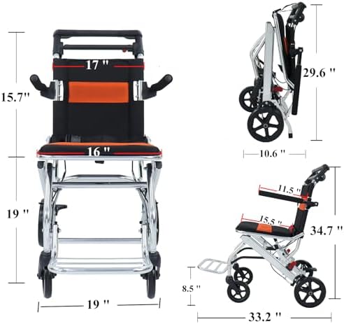 Wheelchair material: The lightweight frame is made of aluminum alloy, which is easy to carry. The tires are made of solid PVC, two front wheels 6 inches, two rear wheels 8 inches, the seat height is 19.2 inches, and the seat width is 16 inches.