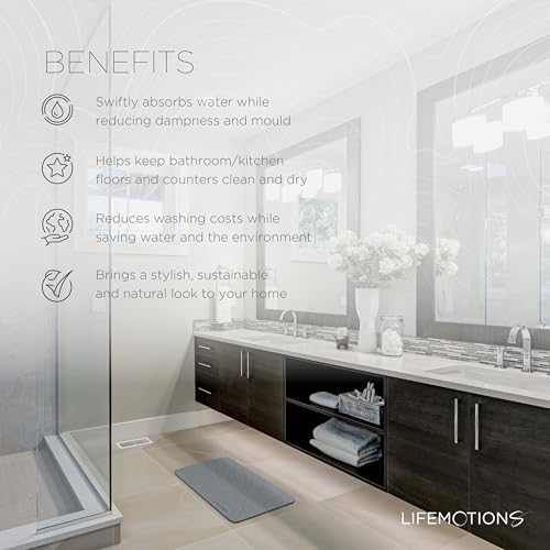 Outstanding Water Absorption: Our super absorbing stone bath mat, made from 100% natural diatomaceous earth, swiftly evaporates water from its surface, ensuring no more soggy mat discomfort. Get stable footing on the bathroom floor mat. Make your home and the planet a safer place with our bathroom mat.