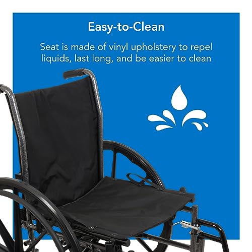 STRONG & DURABLE: Cross-brace steel frame design with a black powder coat finish. Dual axle positioning for height adjustable seat (17” – 20”). Easy-to-clean, comfortable vinyl upholstery that accommodates a wide range of users.