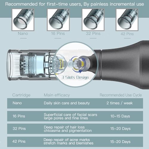 PROFESSIONAL CARTRIDGES: cartridges adopt individual aseptic packaging for disposable use, with no need for extra sterilization. After massive research, the most practical 16 pins, 36 pins, 42pins and painless nano needling are included for you.(6 Pcs 16-Pin+6 Pcs 36-Pin+6 Pcs 42-Pin+2 Pcs Nano).