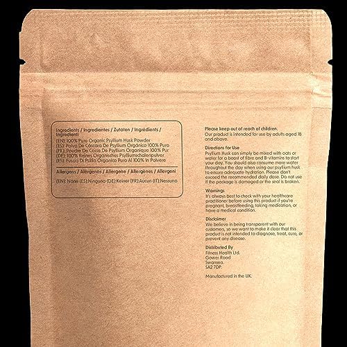 Psyllium Husk Powder 100g | 100% Pure & Natural Fibre Premium Quality100% NATURAL HUSK – High Grade Premium Quality Psyllium Husk, Purest grade available, from the seeds of the Plantago ovato plant .EXTRA FIBRE – Psyllium Husks are a highly soluble source of fibre. Many diets are low in fibre, and fibre is essential for healthy digestion. Our Psyllium Husks Powder is finely ground and thus easy to supplement with foods.SUITABLE FOR VEGETARIANS – YES Suitable for Vegans: YES MANUFACTURED IN THE UK – Good Manufacturing Practice (GMP) approved for complete quality assurance of the highest standard of manufacturing..FITNESS HEALTH UK MADE TRUSTED BRAND – Many supplements have been imported from other countries and often simply bottled here in the UK. Our products are 100% Manufactured in the UK within a GMP compliant. BIODEGRADABLE PACKING – We are reducing our amount of plastic usage and alternately using greener biodegradable products which are better for the planet ACTIVE INGREDIENTS: 100% Psyllium Husk Powder. WHO IS PSYLLIUM HUSK POWDER SUITABLE FOR? Psyllium Husk Powder is suitable for all looking for a convenient way to increase fibre intake.