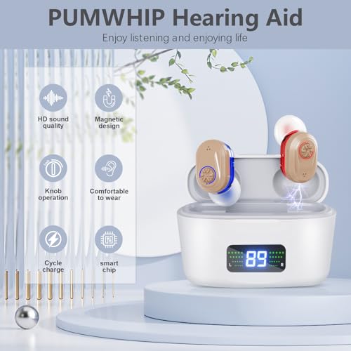 PUMWHIP Hearing Aids, Noise-Canceling Hearing Aids for Seniors with High-Definition digital Displays, Wireless Mini Hearing Aids with Adjustable Volume with Extra Large Capacity Battery Charging Case