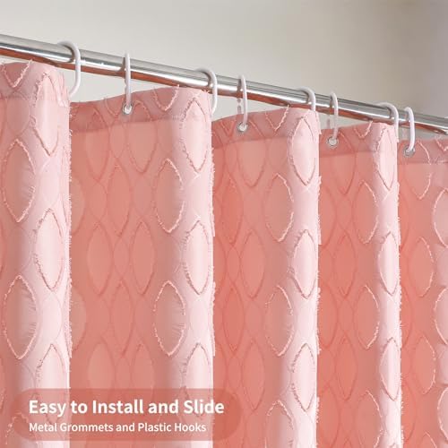 QiyI Pink Fabric Shower Curtain, Boho Bathroom Curtain with Tassel, Tufted Geometric Ogee Textured Cloth Bath Curtain, Modern Minimalist Chic Waterproof Shower Curtain Set with Hooks, 72×72 Inch