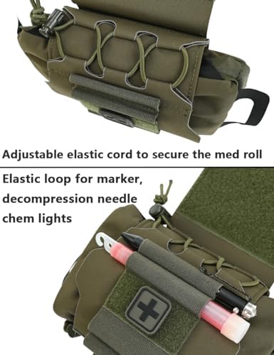 The internal med roll is folded and fastened by bungee cord on sides. The medic pouch is designed to allow rapid deployment of medical suppliers.Remind that the first aid pouch is empty. Any medical kits are not included