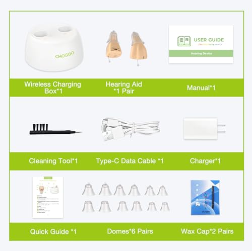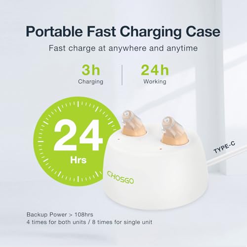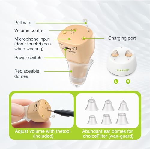 OTC HEARING AIDS VIRTUALLY INVISIBLE: The CHOSGO Rechargeable Hearing Aid is smaller than others. CHOSGO hearing assistance devices are sleek, small, and virtually invisible. They disappear into the ear canal like magic, so no one will know you’re wearing them. The CHOSGO Hearing Aid has a more discreet and invisible fit flush with ear canal, suitable for most customers. Includes built-in, replaceable wax guards for long lasting quality.