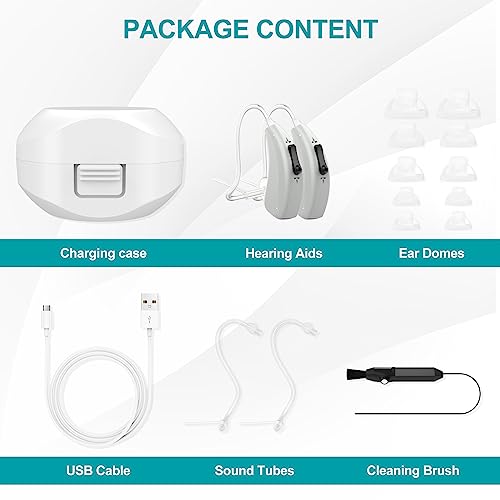 COMPLETE ACCESSORIES – The package including a pair of hearing aids, 6 pairs of domes in different sizes, charging case, a pair of sound tubes, USB charging cable, cleaning brush and user manual.