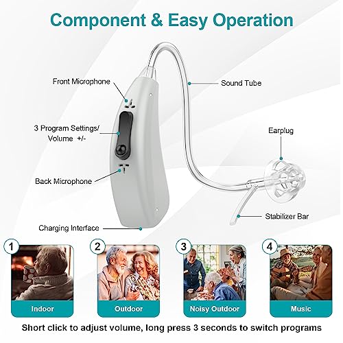 4 HEARING MODES – The hearing aids for senior adults has 4 hearing programs to help you hear better in different situations. Mode 1 (Indoor): stay at home, watching TV, talking with families. Mode 2(Outdoor) : chat with friends, meeting, walking in a quiet park. Mode 3(Noisy Outdoor) : noisy restaurant, airport, supermarket, etc. Mode 4: Music.