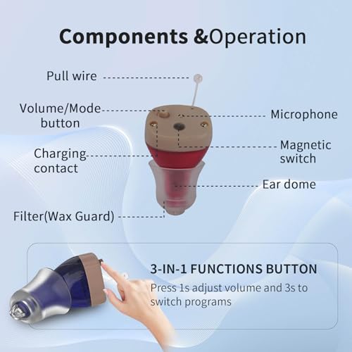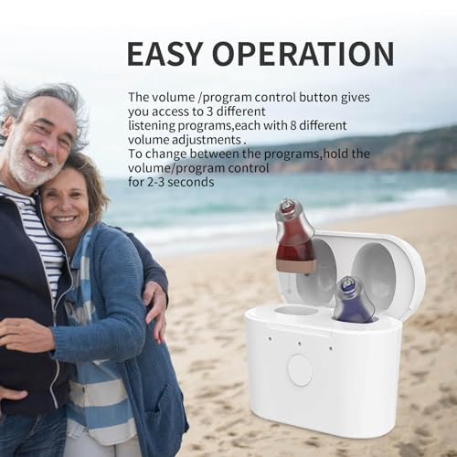 Easy to use: The hearing aids are equipped with easy-to-use buttons, Ear amplifier for hearing you can easily make adjustments to the volume and settings of the hearing aids, depending on the environment you are in. One button for both volume and toggling between the preset programs. Whether you are in a noisy restaurant or a quiet library. The hearing amplifier comes with a charging box and USB charging cable.