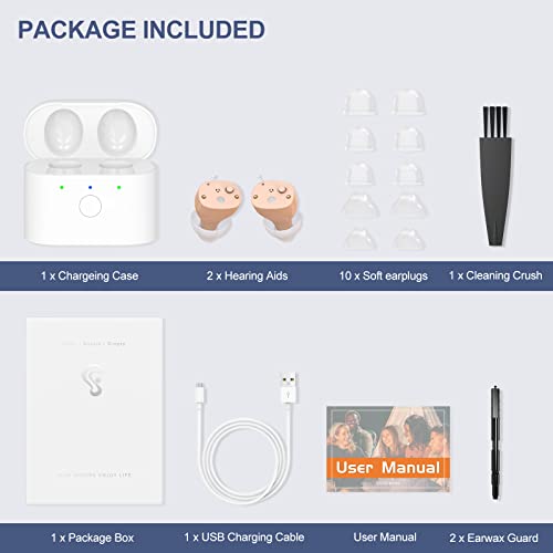 [PACKAGE INCLUDED]: This rechargeable hearing aids for adults ear sound amplifier comes with Five different sizes of “soft earplugs”. You can choose the appropriate soft earplugs according to the size of the ear canal. (Make sure the “Soft earplugs” fit snugly in the ear canal, otherwise there will be a harsh sound.) This product comes with 1 pair of sound amplifier for ears with Chargeing Case, 1 ×chengcleaning brush, 2 × cleaning stick, 1 × charging case, 1 ×USB charging cable and 1 ×manual