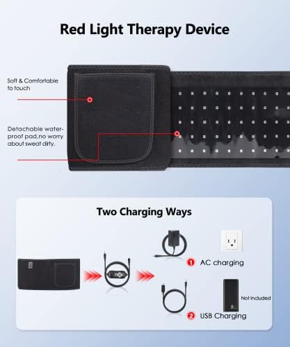 Dual-Spectrum chip: The red light therapy belt has 105pcs LED including 105pcs 660nm red light chips and 210pcs 850nm Near-Infrared light chips.The 660nm red light is visible, it transmit energy to skin surface so that it stimulates repairing cellular and increasing circulation.And the 850nm near-infrared light is invisible, and can penetrate and cause thermal effects to increase tissue temperature, improve cell vitality.