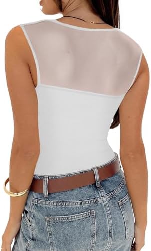 REORIA Women’s Sexy Sleeveless Square Neck Mesh Sheer Double Lined 2024 Trendy Going Out Bodysuit Tops