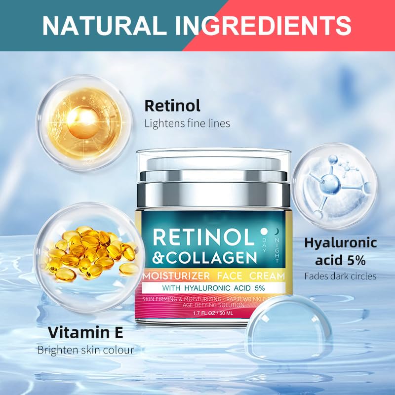 【Moisturizing, Lifting and Firming Face Cream】Packed with the goodness of retinol along with hyaluronic acid and collagen, the cream will help make your skin firmer and smoother within a few days of use. Our retinol collagen cream for face also is effective at normalizing cell turnover and locking in moisture for more youthful appearance.