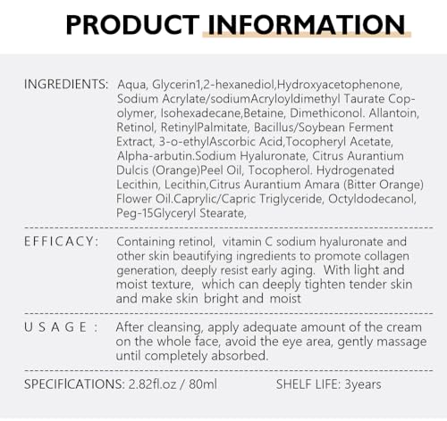 Anti Aging Face Moisturizer: Retinol α-Arbutin Vitamin E and Sodium hyaluronate working in harmony, replenishing nourishing and hydrating, evening tone, improving firming soft skin. Stabilizing double-retinol, long-term use safe, face neck and chest overall wrinkle reduce solution.