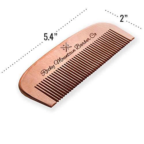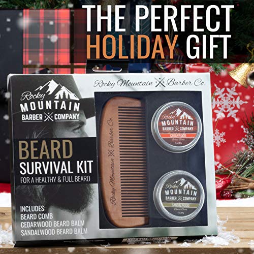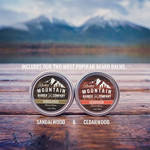 Rocky Mountain Barber Company Beard Gift Set – All-In-One Beard Care Kit with Wooden Beard/Hair Comb and Two Beard Balms (Cedarwood and Sandalwood – 1oz) – Packaged in Gift Box