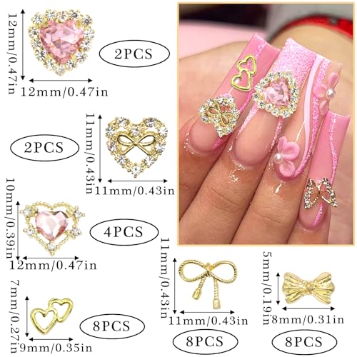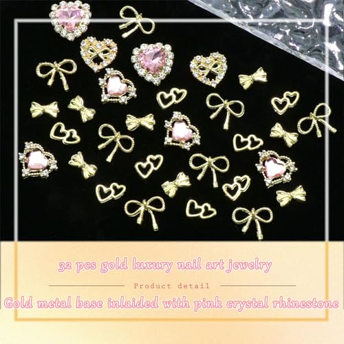 RODAKY 32PCS Gold Nail Charms Bow Nail Gems 3D Heart Nail Art Charm with Pink Rhinestone Cute Shiny Nail Jewelry for Women Manicure Nail Decorations for Nails Art
