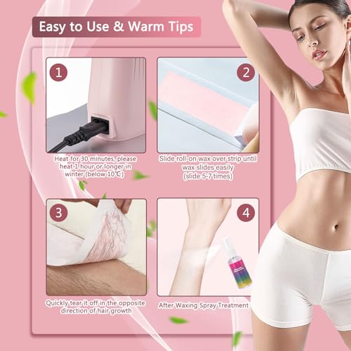 ✅Easy to Use Roller Wax Kit: The roll on wax warmer kit can be used for hair removal in all areas of the body, but it is best for waxing larger areas. Remove unwanted hair easily, quickly, and conveniently. [💝Note] Conduct a temperature and skin test before depilation to avoid scalding and adverse reactions.