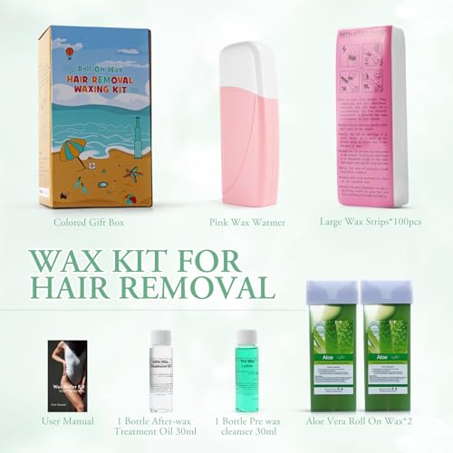 Waxing Kit for Women Men: The waxing kit includes a 40W pink portable wax warmer for hair removal, 2 aloe roll on wax refill, 100 large non-woven wax strips, 2 bottles of wax treatment oil. Ideal hair removal waxing kit products for women and men.
