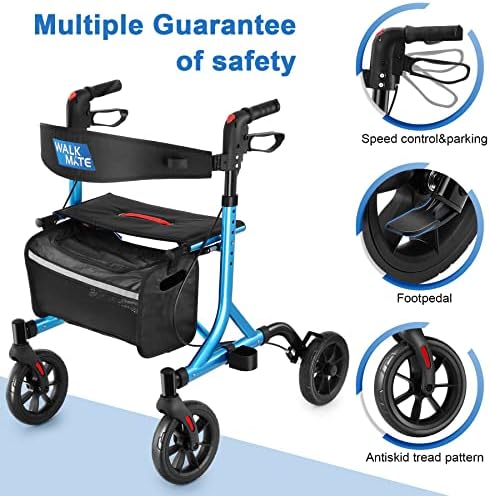 【8 Inch Wheels Fit for All Terrain】WAlK MATE rollator walker for the elderly comes with 8” front wheels, the anti-skid tread pattern on wheels can provide greater grip on wthe ground to prevent your Rollator from slipping while walking, and this 8″ larger wheel walker suitable for most terrain.
